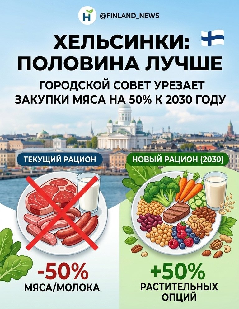 Городской совет Хельсинки официально одобрил амбициозную инициативу, направленную на радикальное изменение системы общественного питания. К 2030 году столица Финляндии планирует сократить закупки мясной и молочной продукции для нужд города на 50%. Это решение ставит Хельсинки в авангард европейских городов, борющихся с климатическим кризисом через реформу продовольственной системы.
